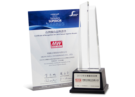 2010年,明緯榮獲經濟部國際貿易發展局頒發「2010臺灣優良品牌獎」,創辦人林國棟先生代表明緯集團領獎,此獎肯定明緯長期深耕自有品牌的努力與成果。