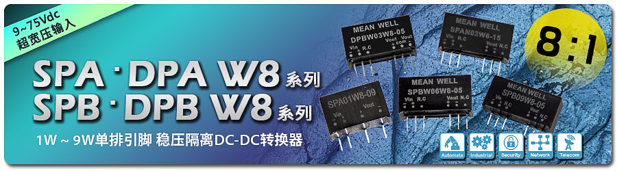 明緯 DC-DC 模塊型單組輸出 SPA01 / SPAN02 / SPBW03 / SPBW06 / SPB09 及雙組輸出 DPAN02 / DPBW03 / DPBW06 / DPB09 SIP 單排引腳封裝 1~9W 2:1 及 4:1 輸入機型上市多年,年銷數十萬臺,廣泛應用于電力、電子儀表、通信設備、工業自動化控制、IoT…等, 新上市超寬壓輸入單組輸出 SPA01W8 / SPAN02W8 / SPBW03W8 / SPBW06W8 / SPB09W8 及雙組輸出 DPA01W8 / DPAN02W8 / DPBW03W8 / DPBW06W8 / DPB09W8 等 5 系列,最大亮點為 8:1(9~75Vdc)超寬壓輸入范圍,不僅可滿足更寬輸入電壓需求,更因輸入范圍統一為 9~75Vdc,機型選擇大幅簡化,讓選型變得更容易。新品 5 系列引腳與舊品兼容,可讓終端設備設計者以新代舊無痛替換,新 vs 舊世代主要特點及規格差異請參考下表: