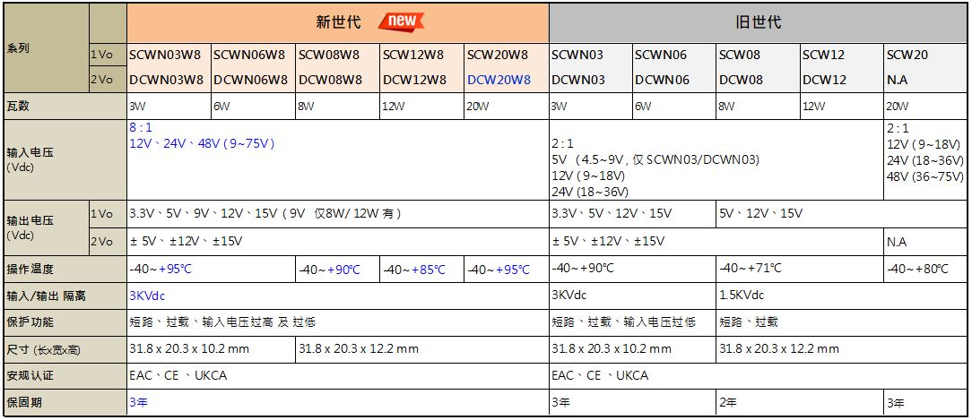 明緯DC-DC模塊型單組輸出SCWN03/ SCWN06 / SCW08 / SCW12 / SCW20及雙組輸出DCWN03 / DCWN06 / DCW08 / DCW12 DIP 雙排標準引腳封裝3~20W 2:1 輸入機型上市多年,年銷數(shù)十萬臺,廣泛應用于電力、電子儀表、通信設備、工業(yè)自動化控制、IoT…等, 新上市次世代8:1輸入超寬壓輸入單組輸出 SCWN03W8/ SCWN06W8 / SCW08W8 / SCW12W8 / SCW20W8及雙組輸出 DCWN03W8 / DCWN06W8 / DCW08W8 / DCW12W8/ DCW20W8共5系列。