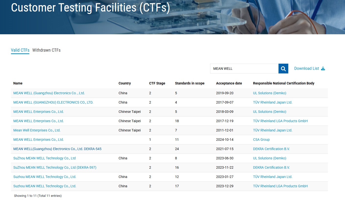 近期,明緯更進一步取得 UL 與 DEKRA 認可之CTDP (WTDP)及 CTF(Customer Testing Facility)IEC/UL ANSI/AAMI ES 60601-1醫療安規實驗室資格,象征明緯在醫療電源與高可靠度產品領域的安規實力,已達國際認證機構高度信賴的水平。在 UL 體系中,UL WTDP(Witness Test Data Program)與 UL CTDP(Client Test Data Program)同樣是建立于信任與能力評鑒基礎上的制度。WTDP 允許企業在 UL 見證下執行測試,而 CTDP 則進一步授權合格實驗室可自行完成測試并提交數據,縮短產品驗證時程。CTF 制度源自 IECEE CB 體系,允許通過審核的企業在自有實驗室依 IEC 標準進行測試,其測試結果可直接用于多國 CB 認證,大幅提升認證效率。此次明緯獲得 UL 與 DEKRA 的CTDP (WTDP)及 CTF認可,正是對明緯實驗室管理制度、技術能力與質量紀律的高度肯定。