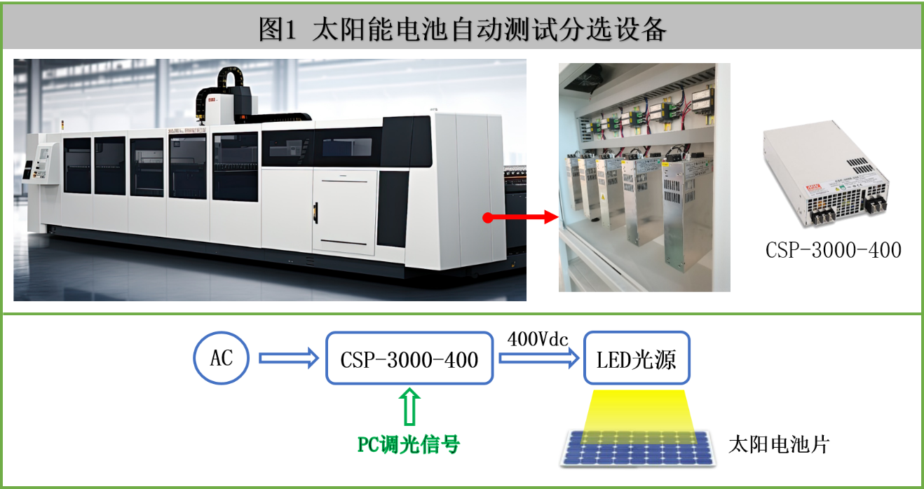 - 如下圖 1 為太陽能電池自動測試分選設備。內部使用 5 組獨立 LED 光源數組,以仿真太陽光的光譜和光照強度,并配備數據讀取與計算、電子負載等設備,用于測試光伏器件 (如太陽能電池片等) 的性能,包括轉換效率、V-I 特性等。每組 LED 光源為 400Vdc/2000W,由 5 臺 CSP-3000-400 獨立恒流驅動,使用 PC 電壓訊號穩定調整光照強度