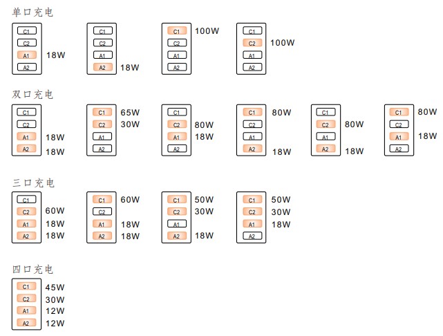 支持 PD(Power Delivery) 3.0 和 QC (Quick Charge)2.0、3.0 等主流快充協(xié)議,可滿足包括筆記本電腦、平板計(jì)算機(jī)、智能手機(jī)等多種設(shè)備的高效充電需求。下圖詳細(xì)說(shuō)明了不同數(shù)量接口充電時(shí)各接口支持的最大功率: